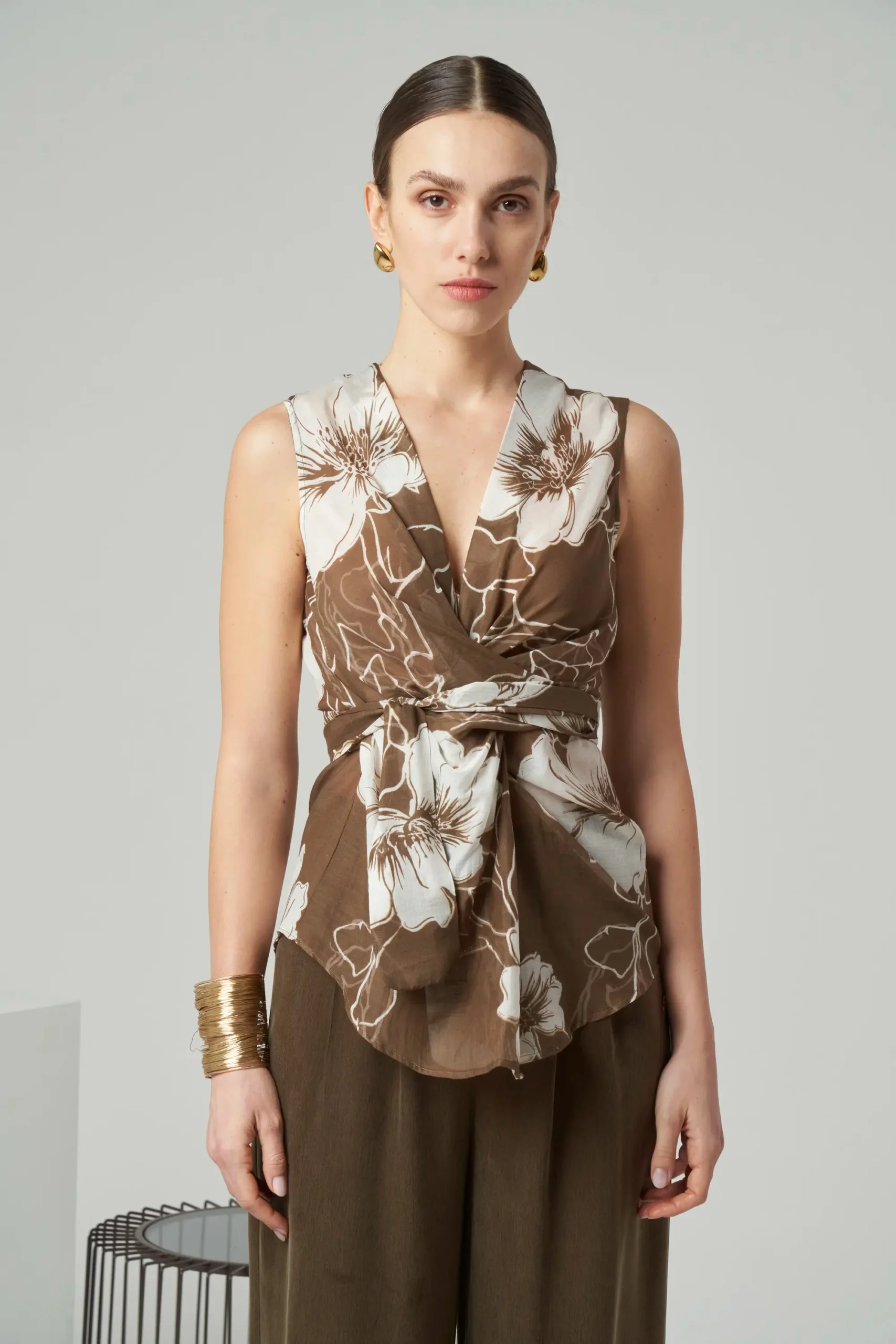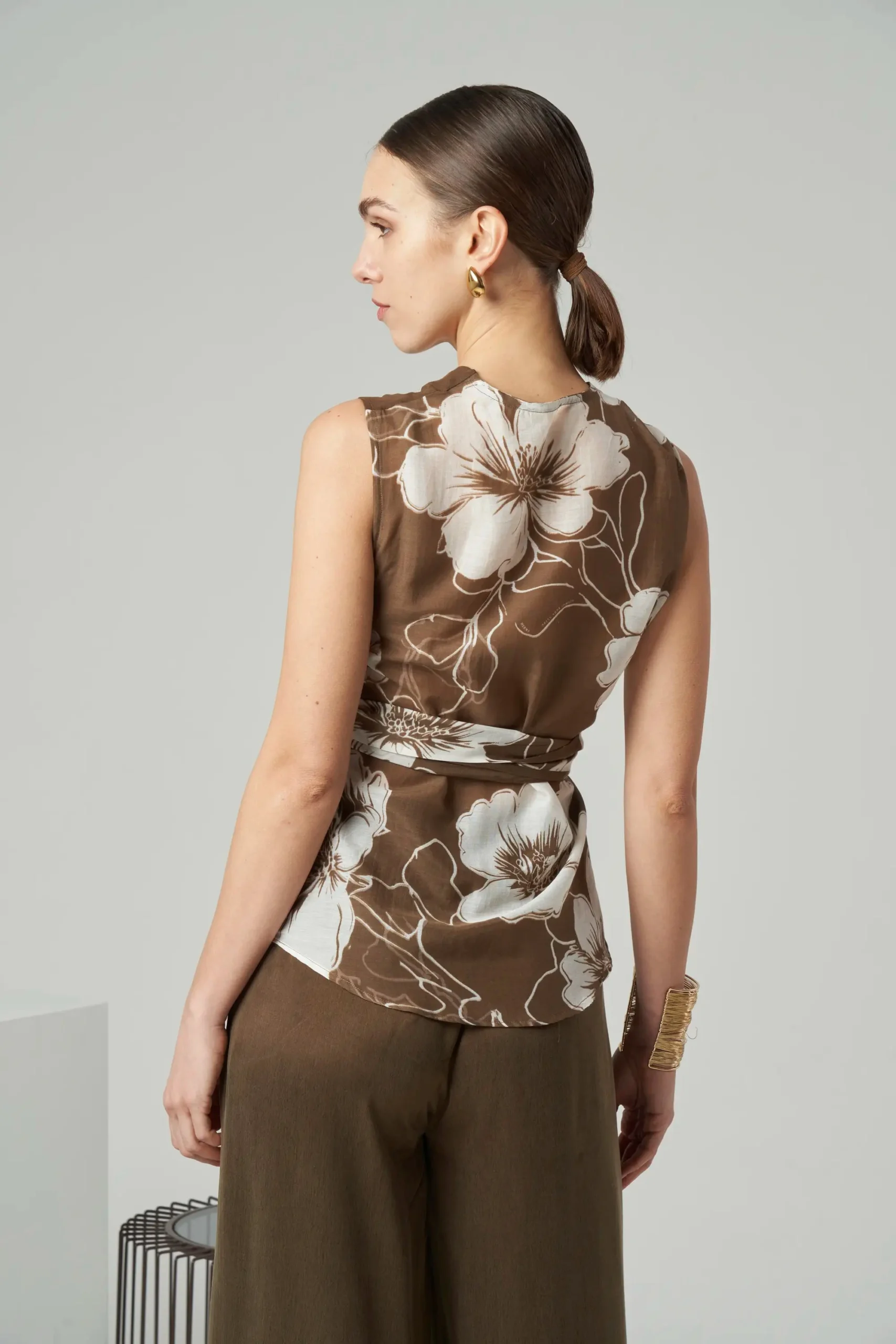 Sleeveless printed top in cotton-silk blend with soft drape.