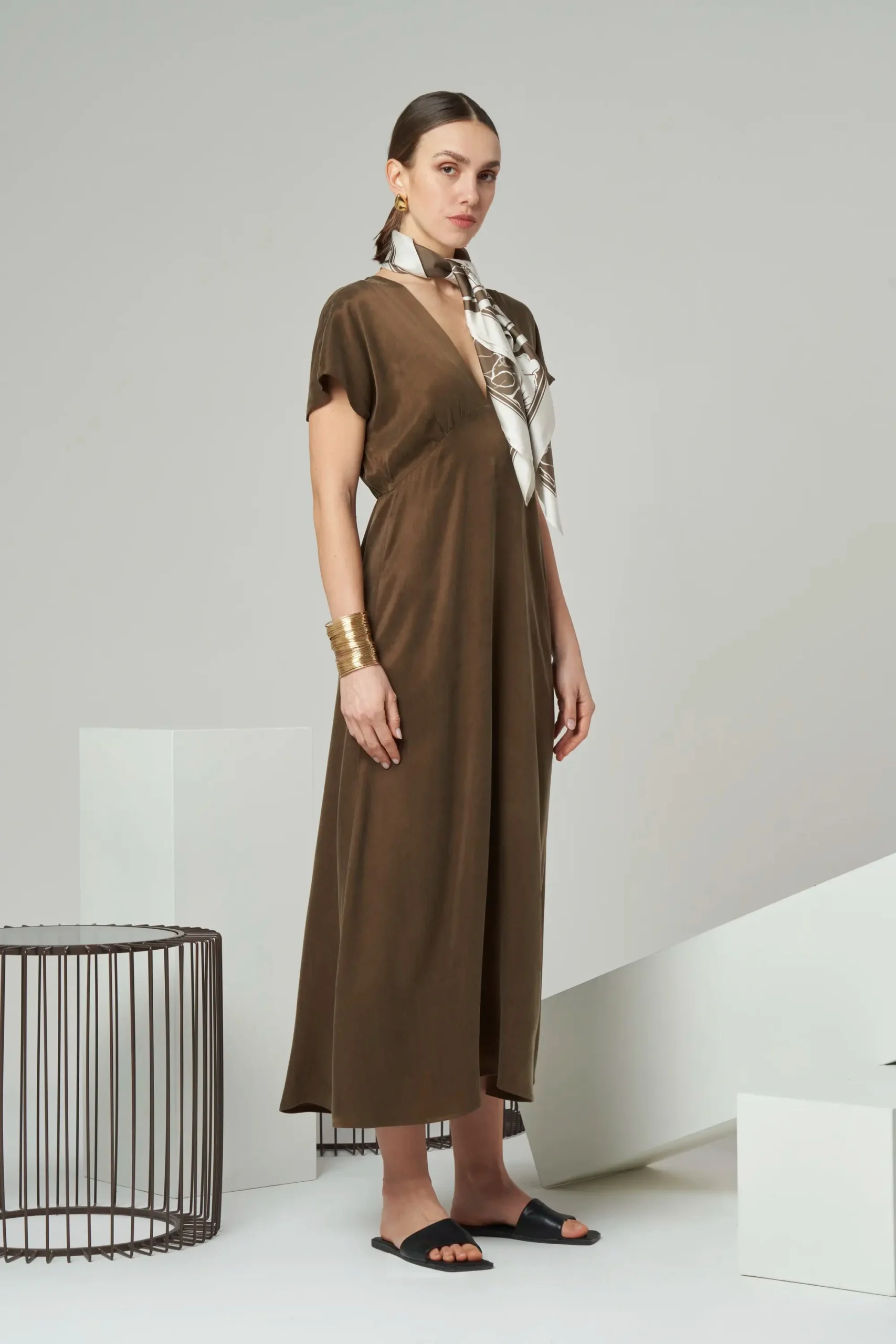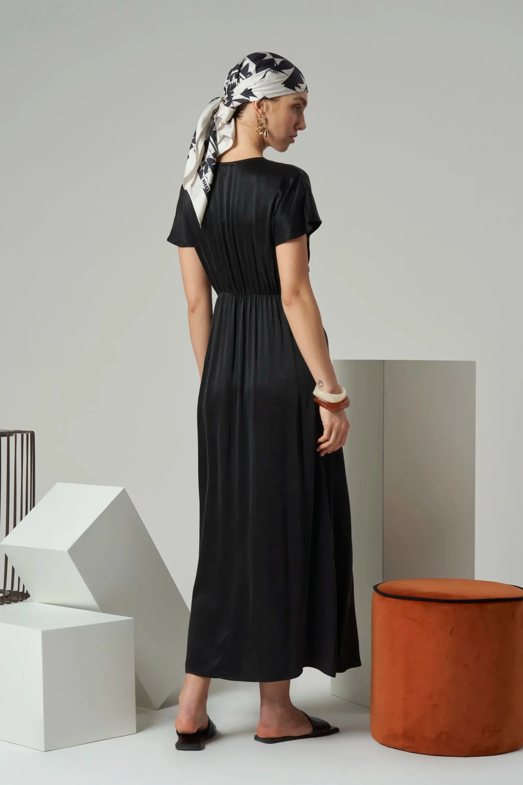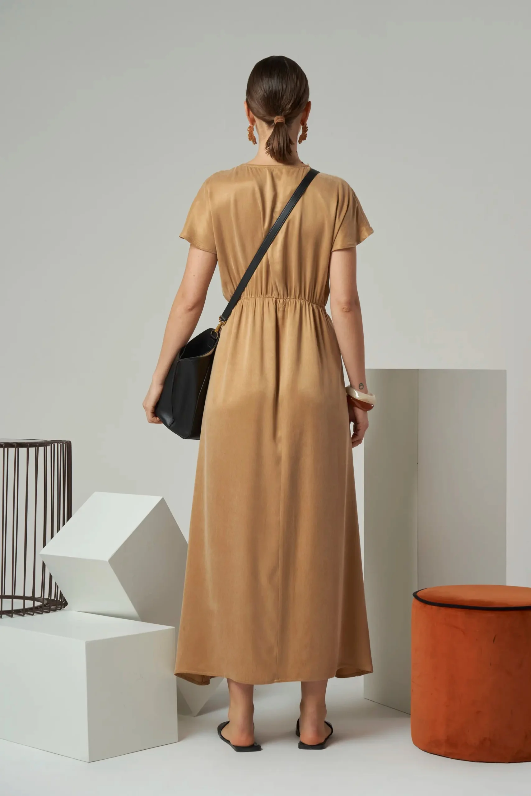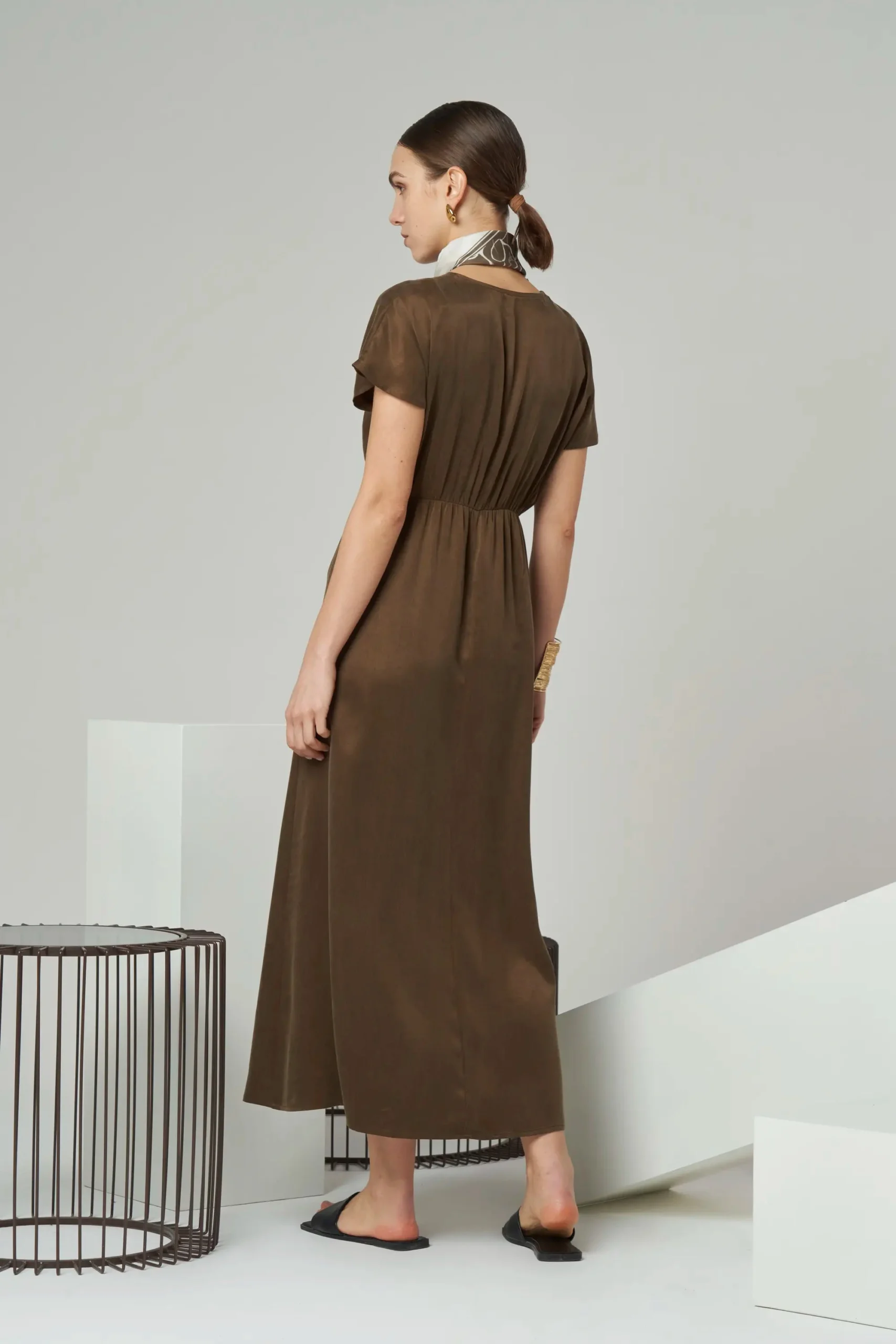 Fluid midi dress in cupro-viscose blend with relaxed silhouette.