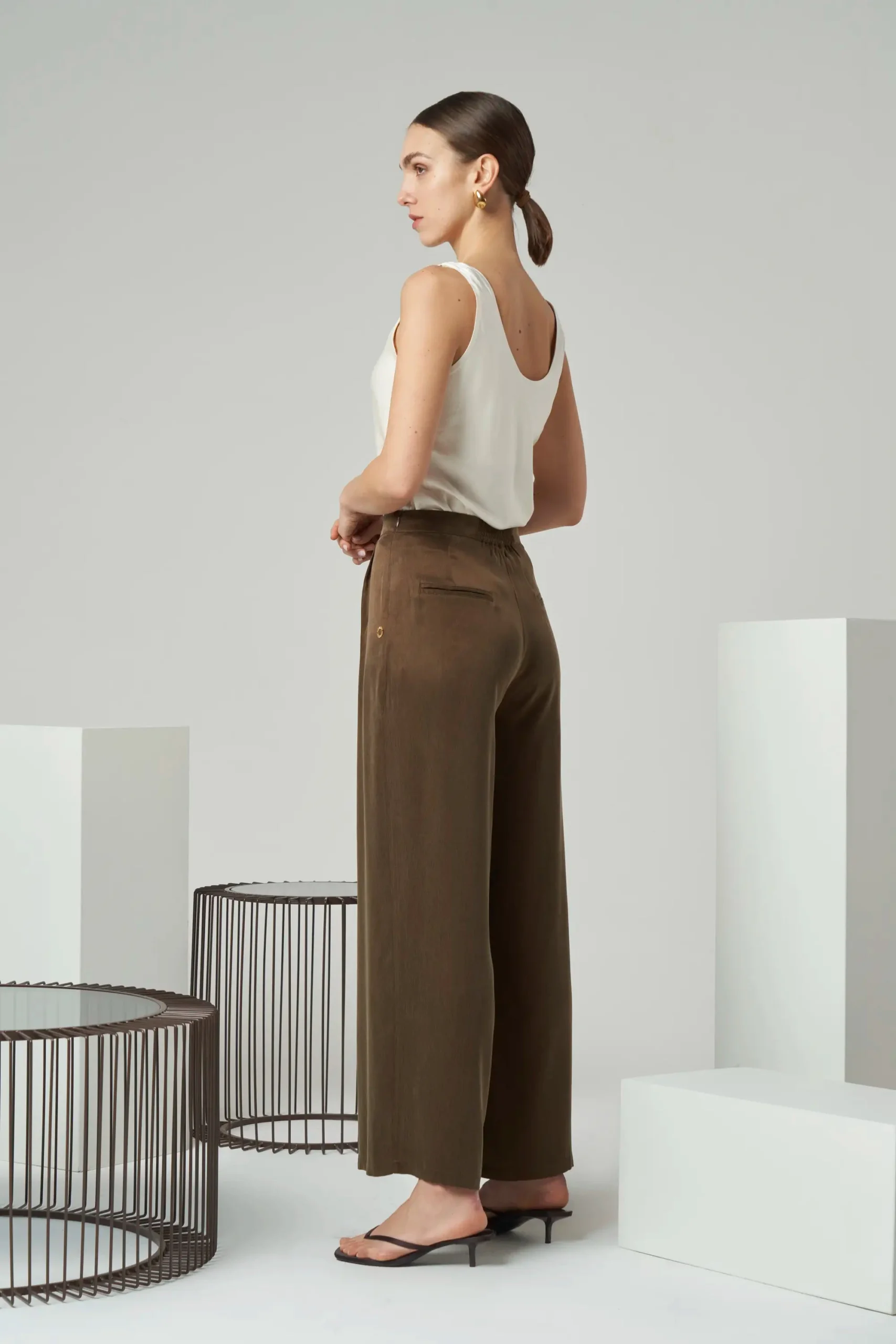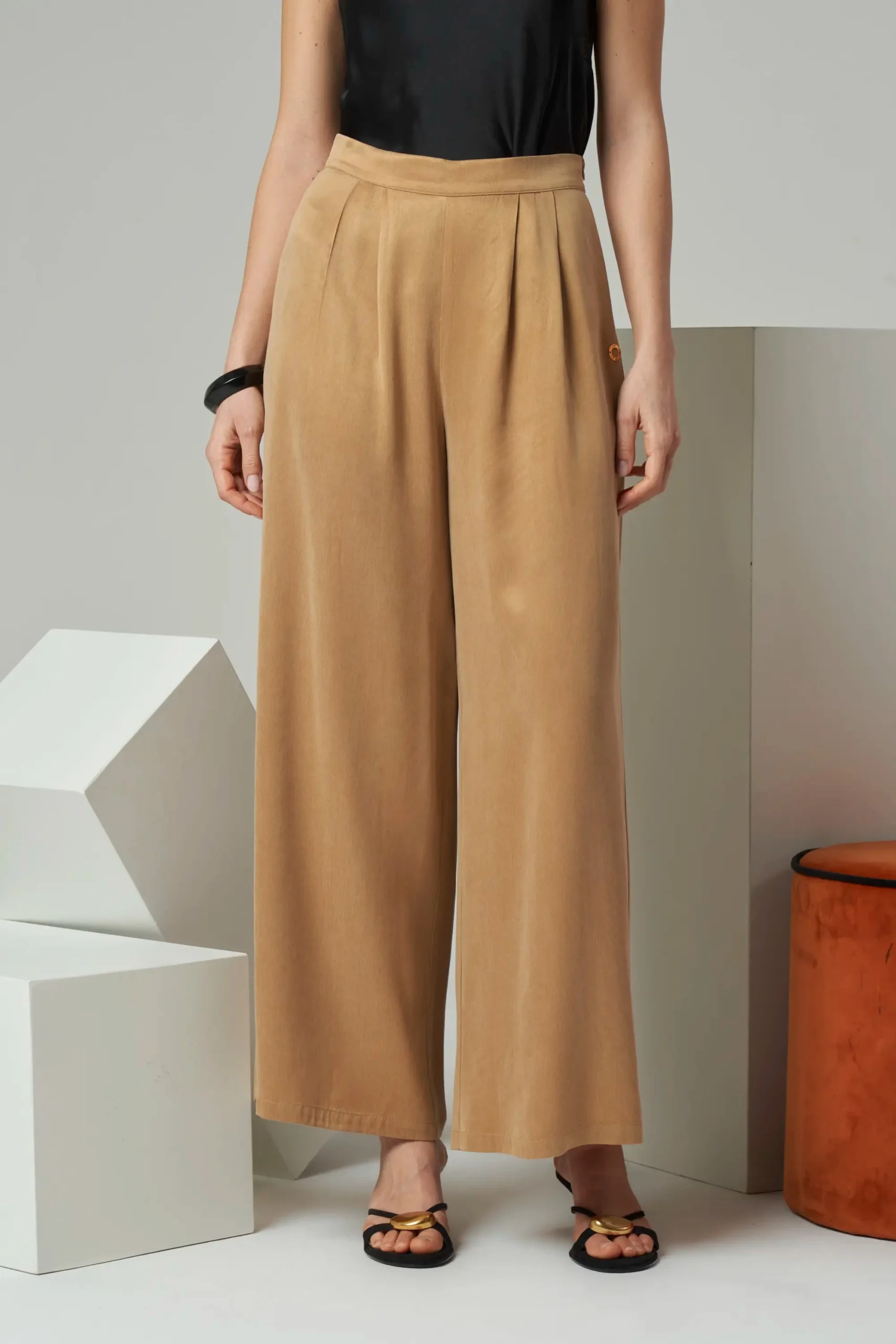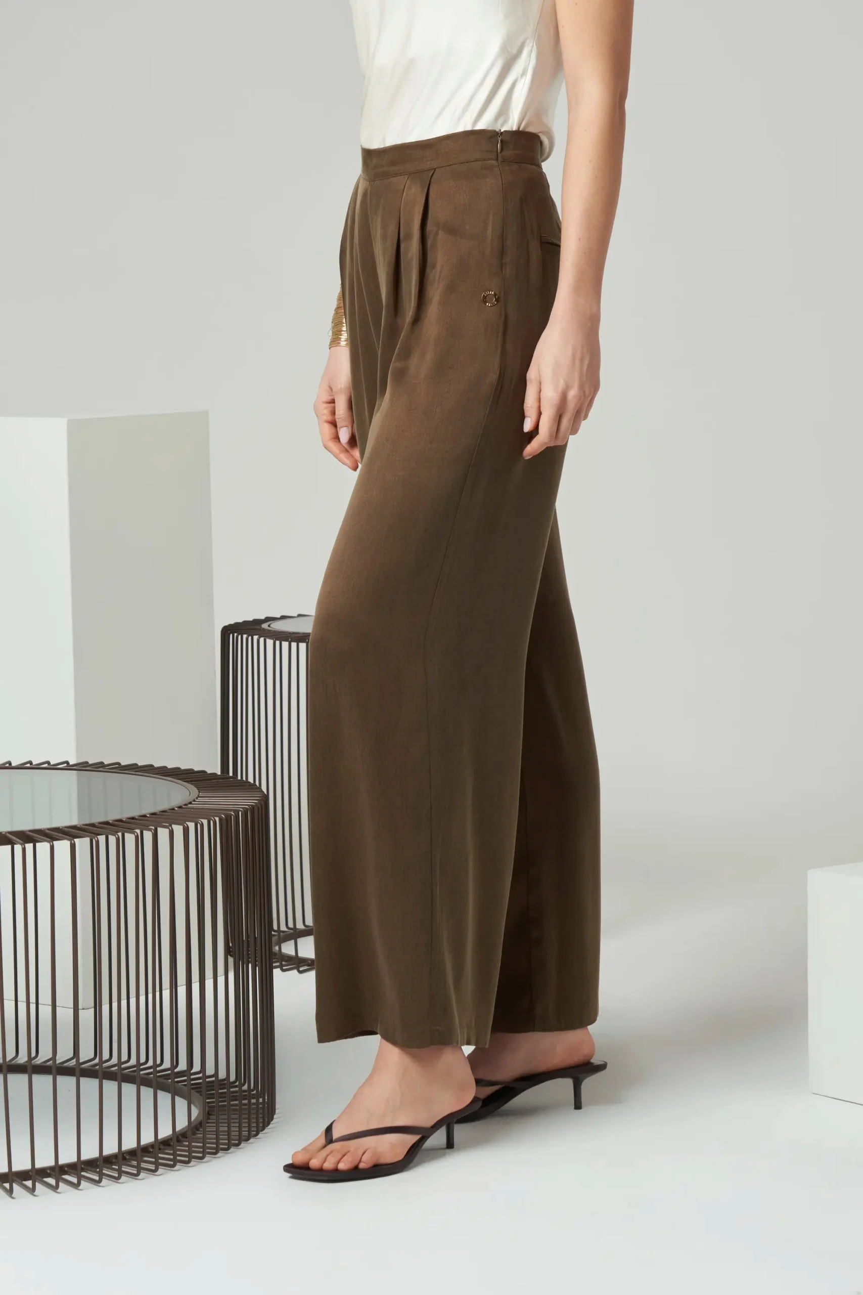 Wide-leg trousers in cupro-viscose blend with fluid movement.