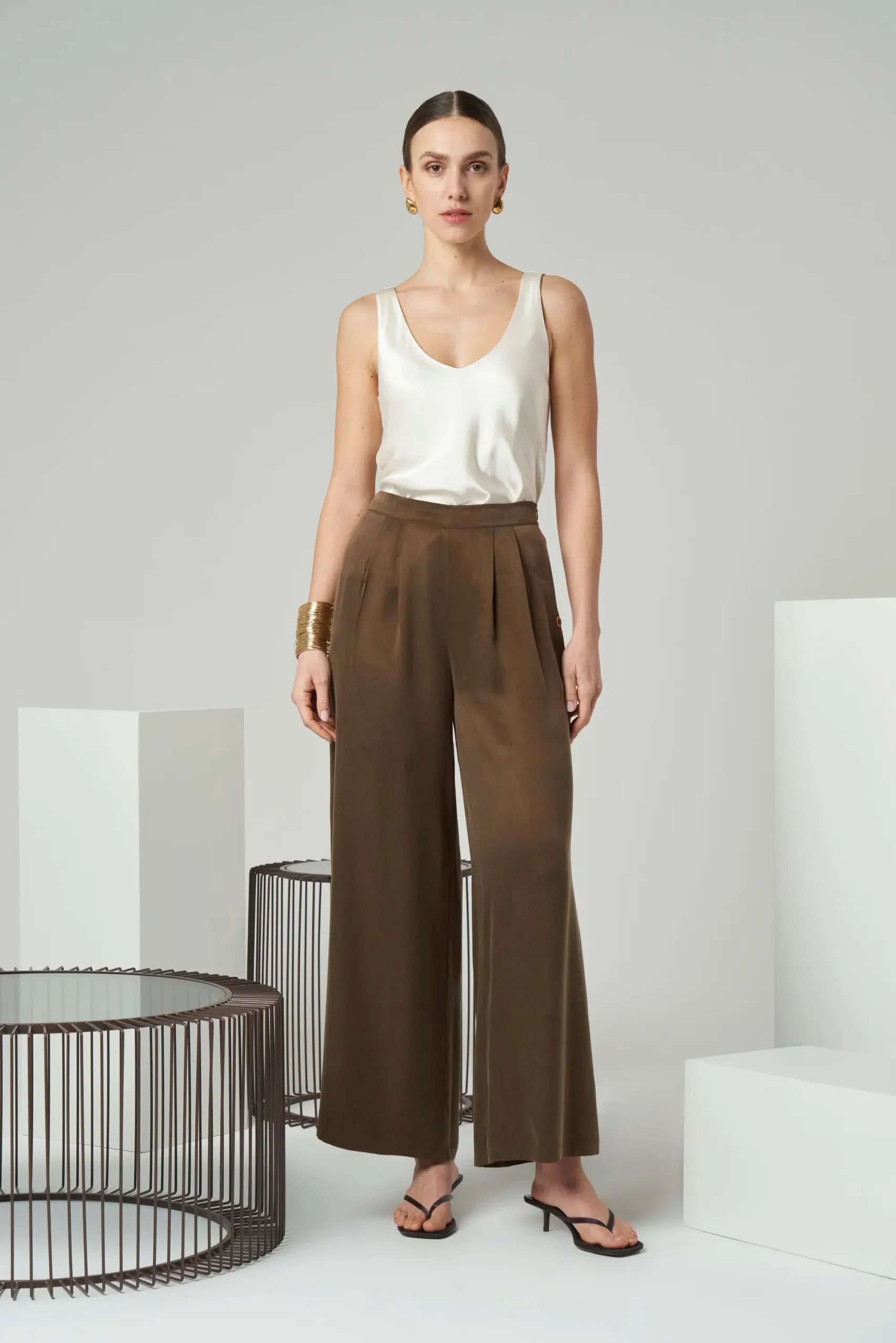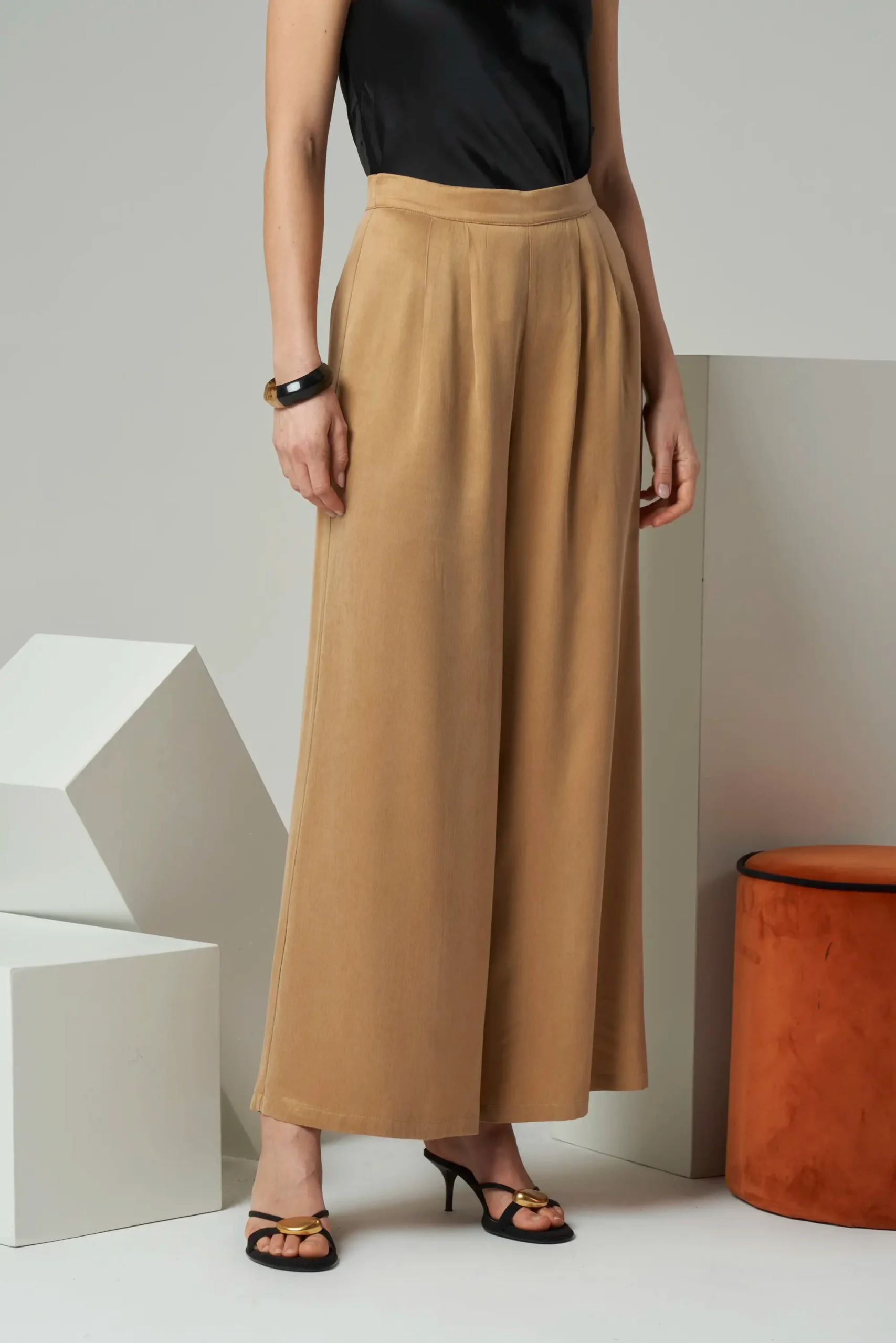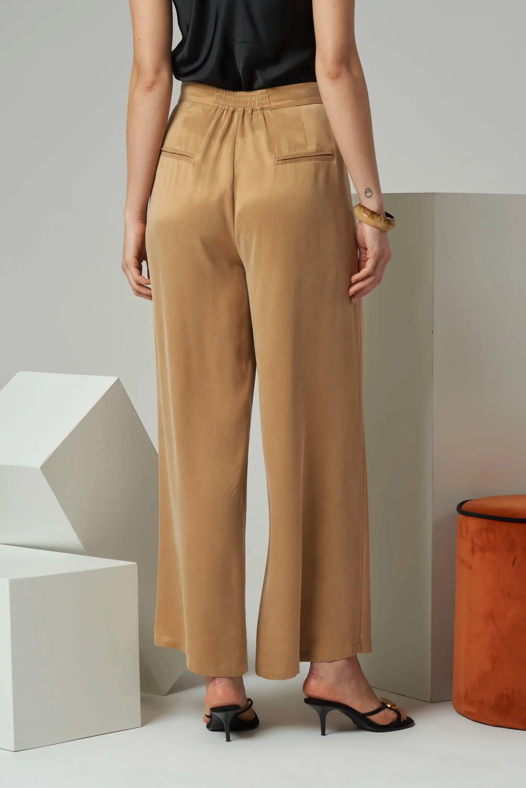Wide-leg trousers in cupro-viscose blend with fluid movement.