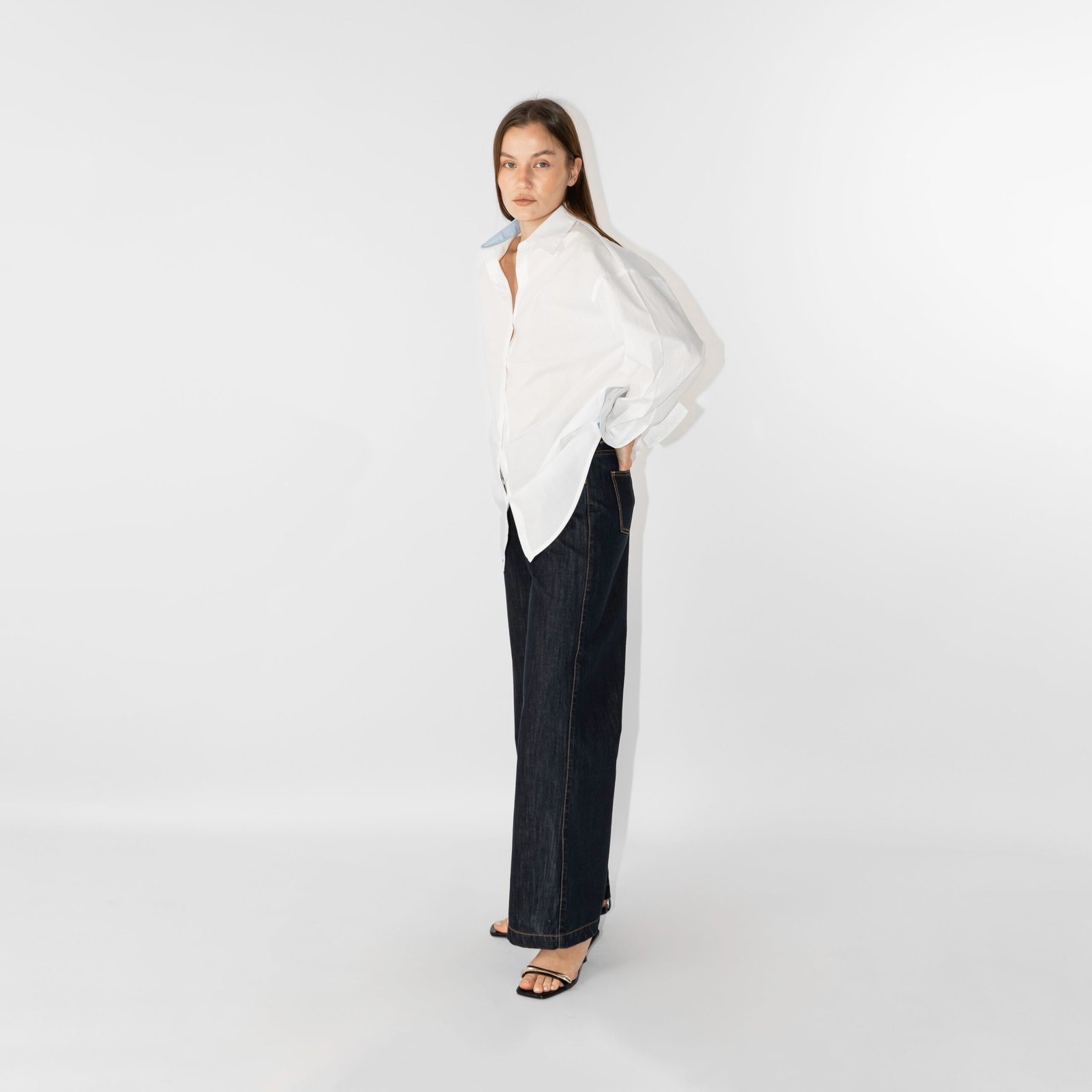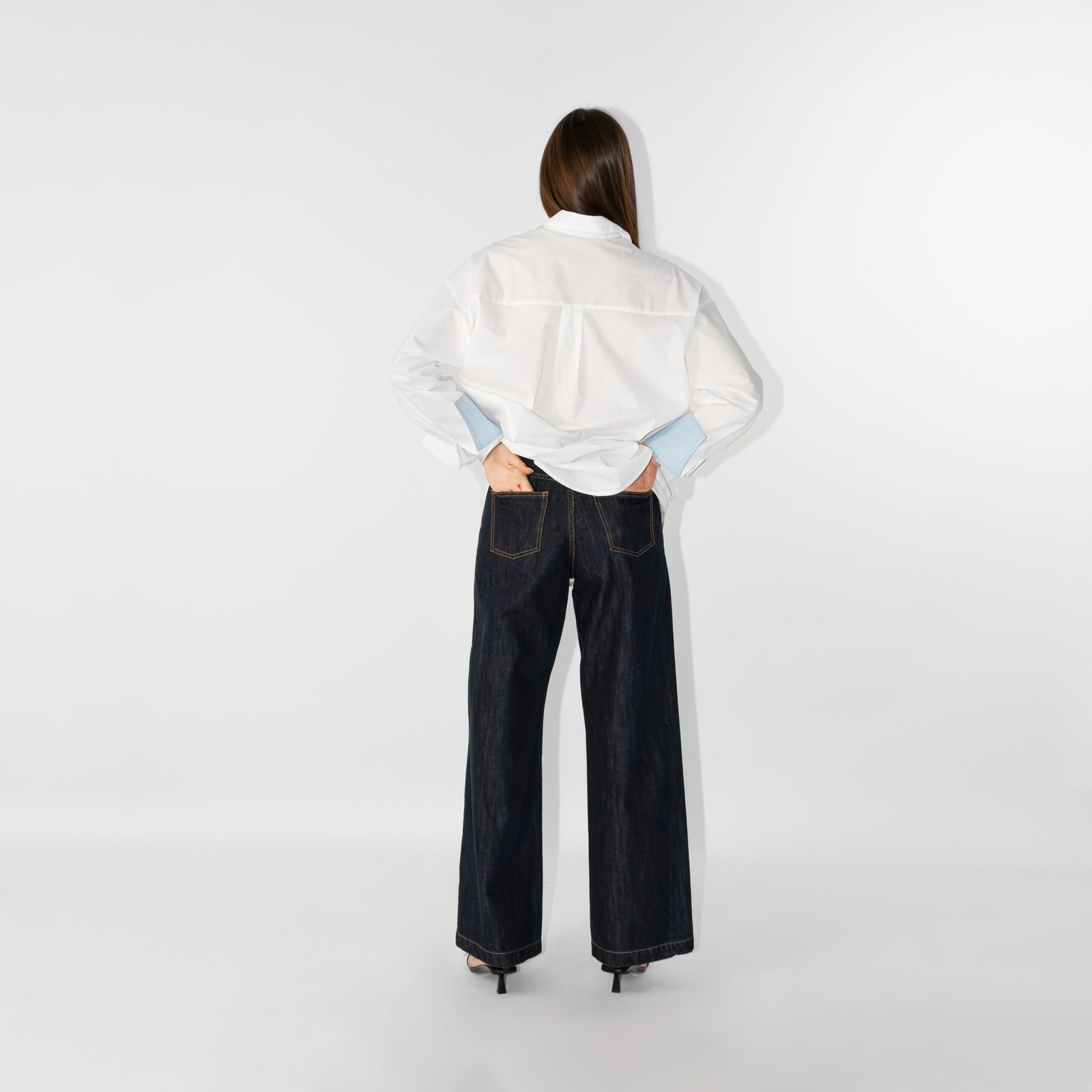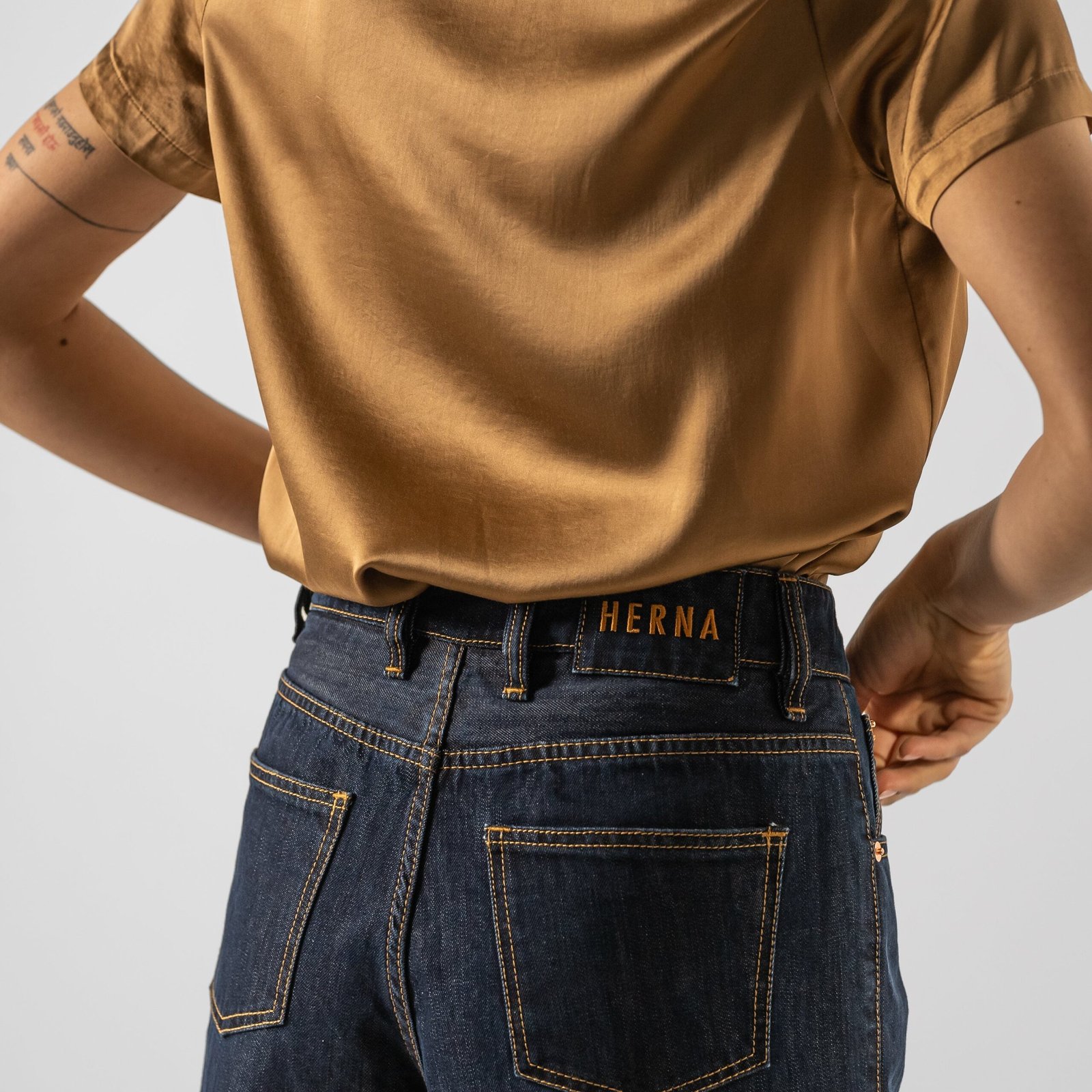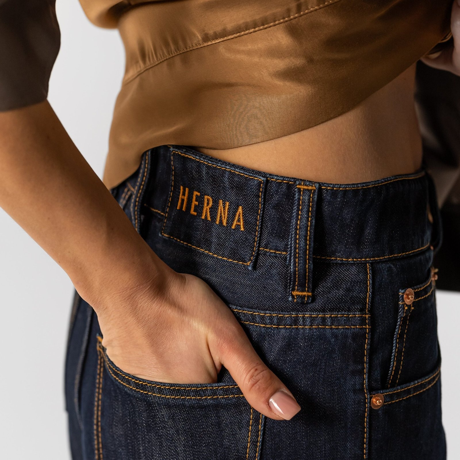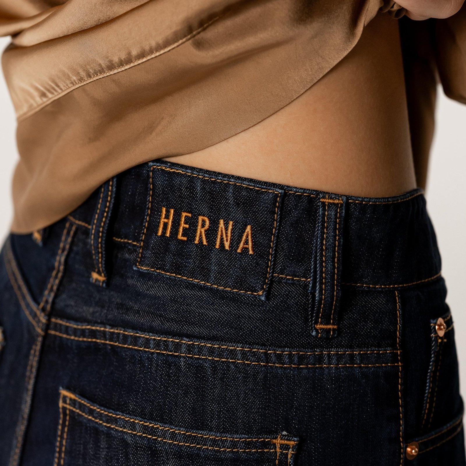 Realizzato in denim, questo pantalone si distingue per il suo taglio dritto morbido e la sua costruzione curata nei minimi dettagli. Caratterizzato da impunture a contrasto e dalla firma HERNA ricamata sulla tasca posteriore, aggiunge un tocco distintivo e contemporaneo al tuo guardaroba. Perfetto per uno stile casual raffinato o abbinato a capi più eleganti per un contrasto moderno.