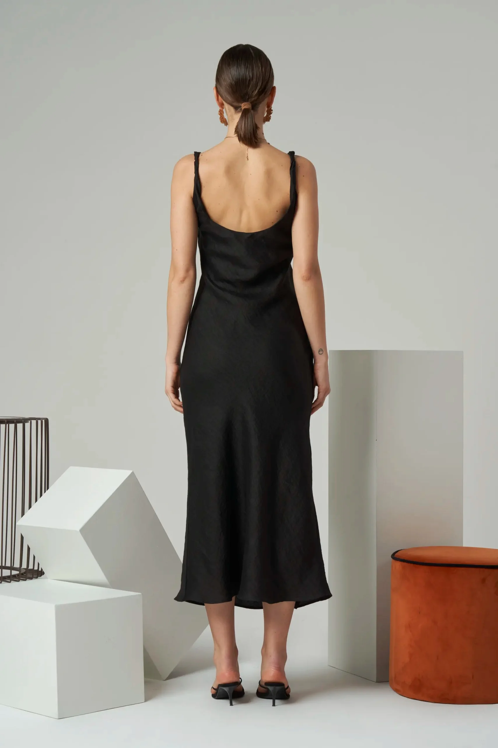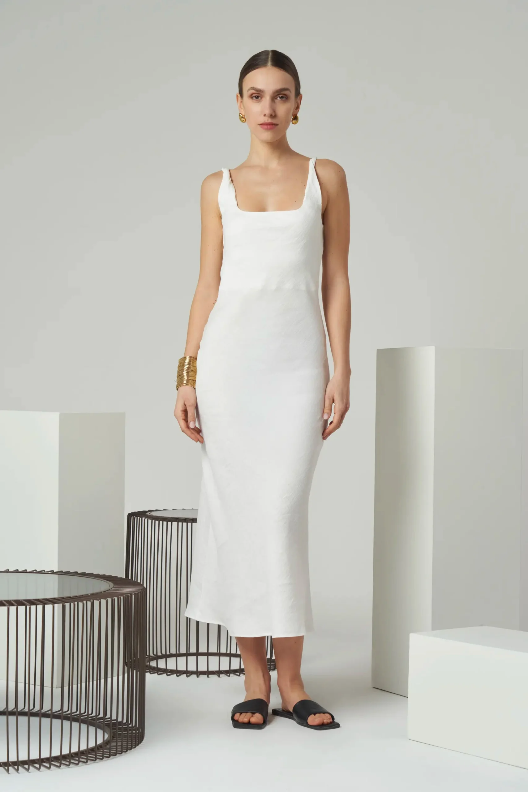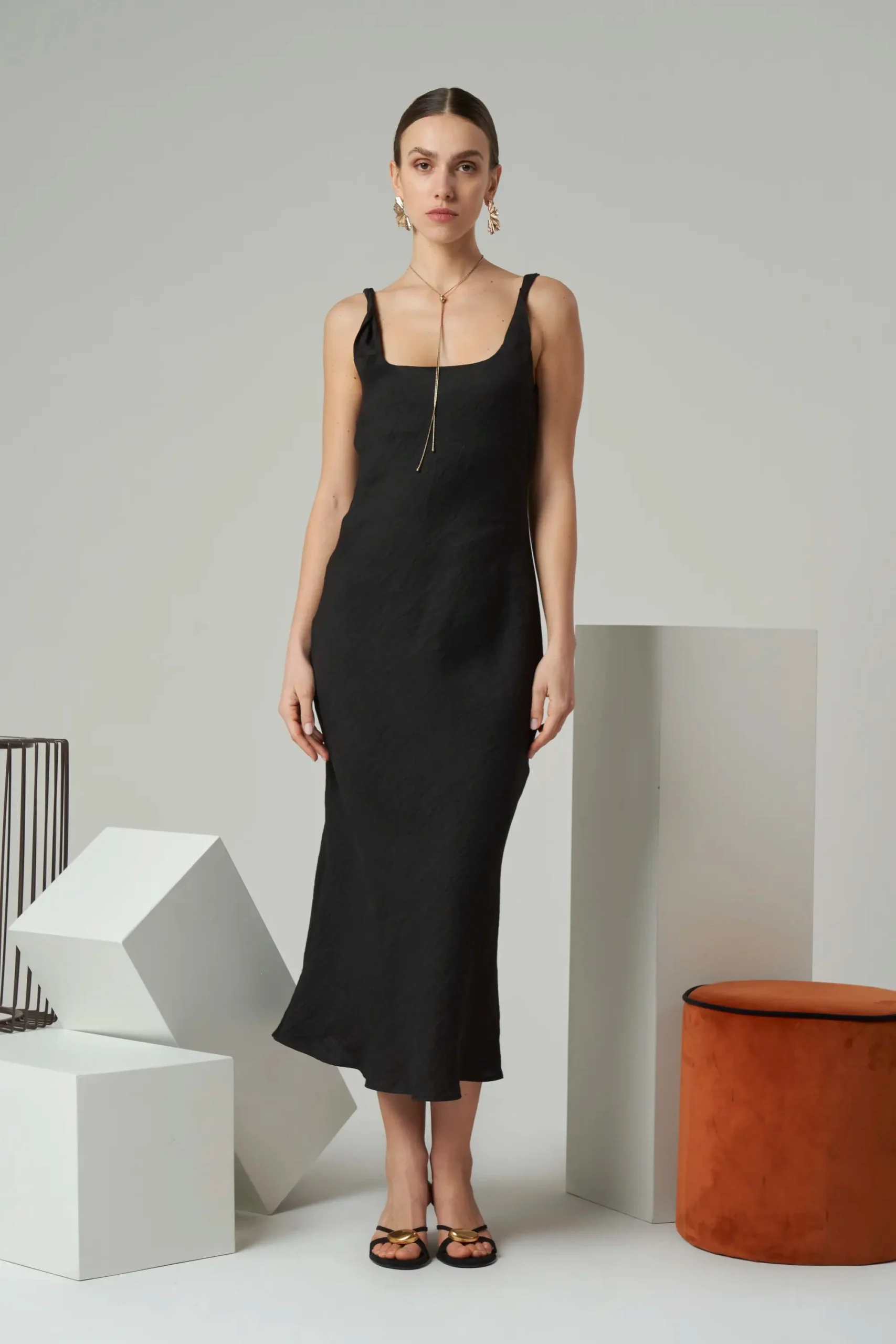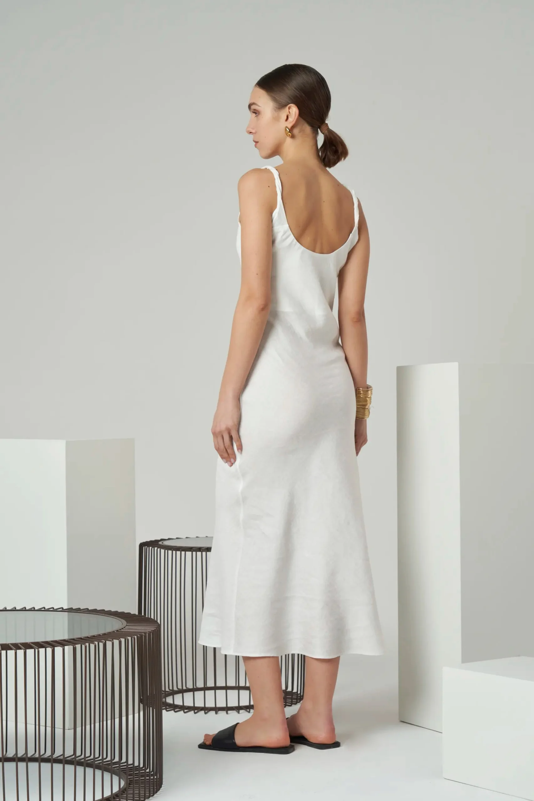 Minimal sleeveless midi dress with twisted shoulder straps in linen blend.
