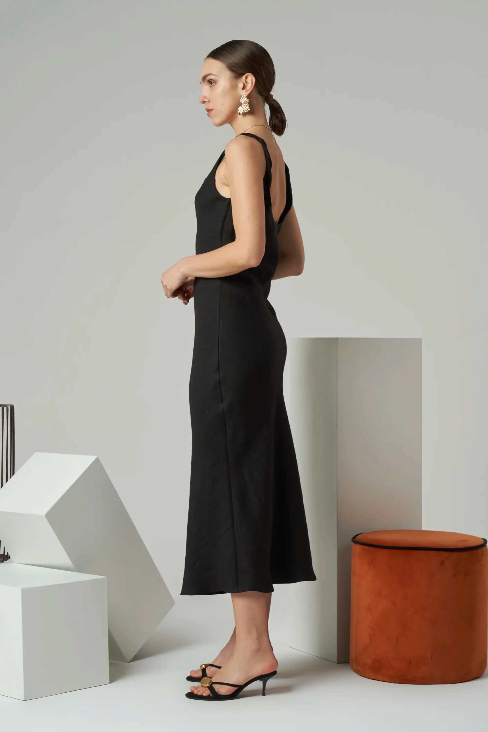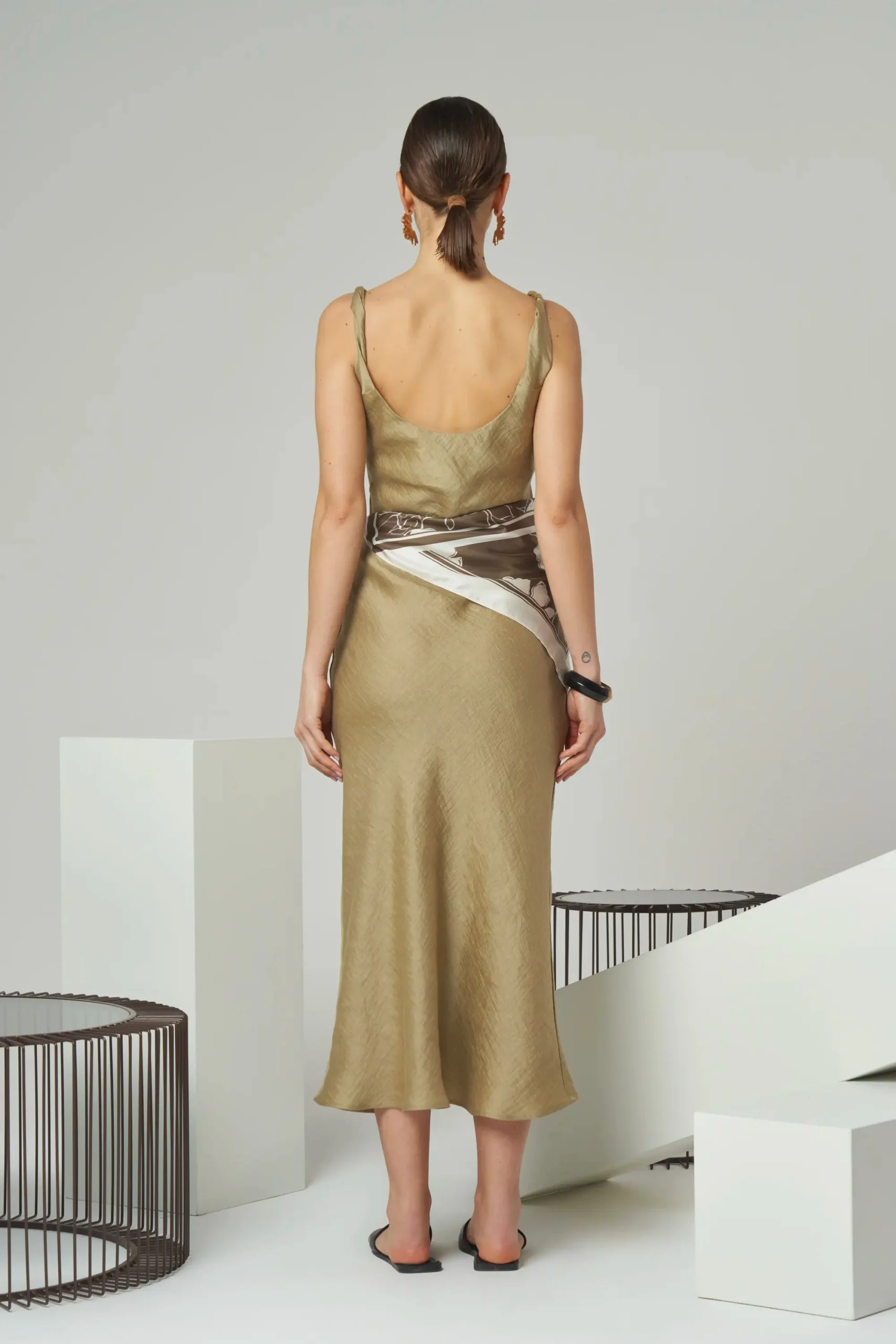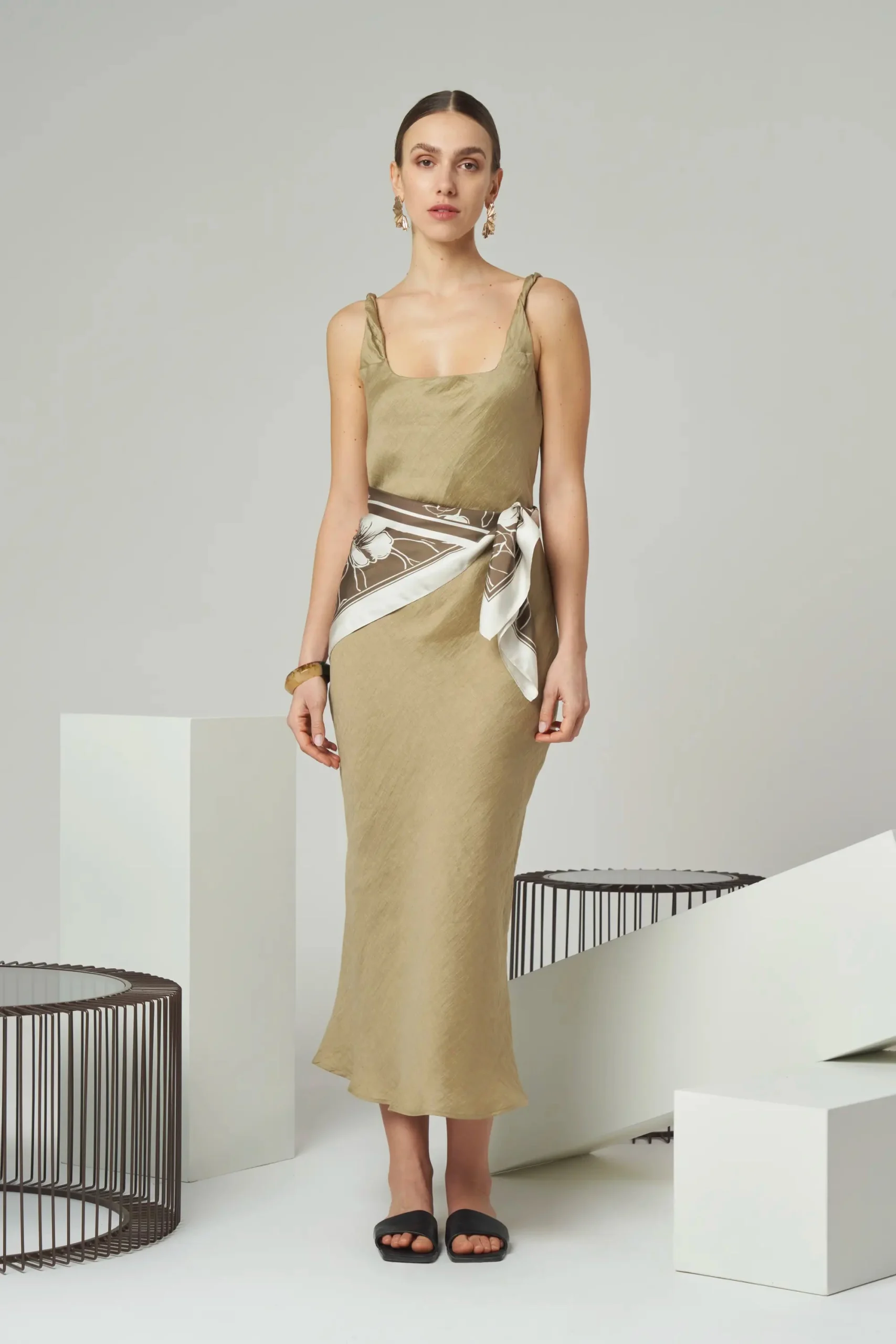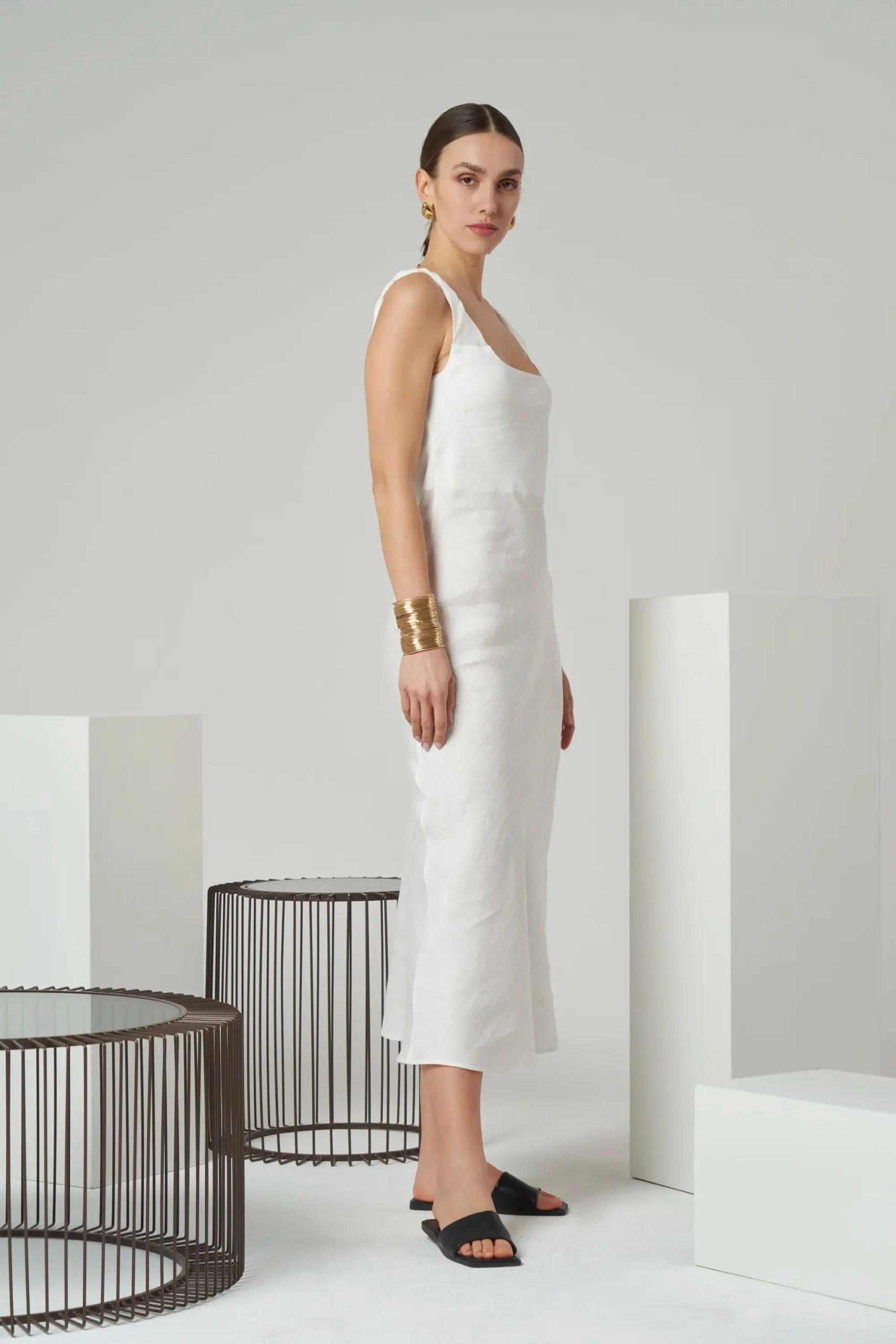 Minimal sleeveless midi dress with twisted shoulder straps in linen blend.