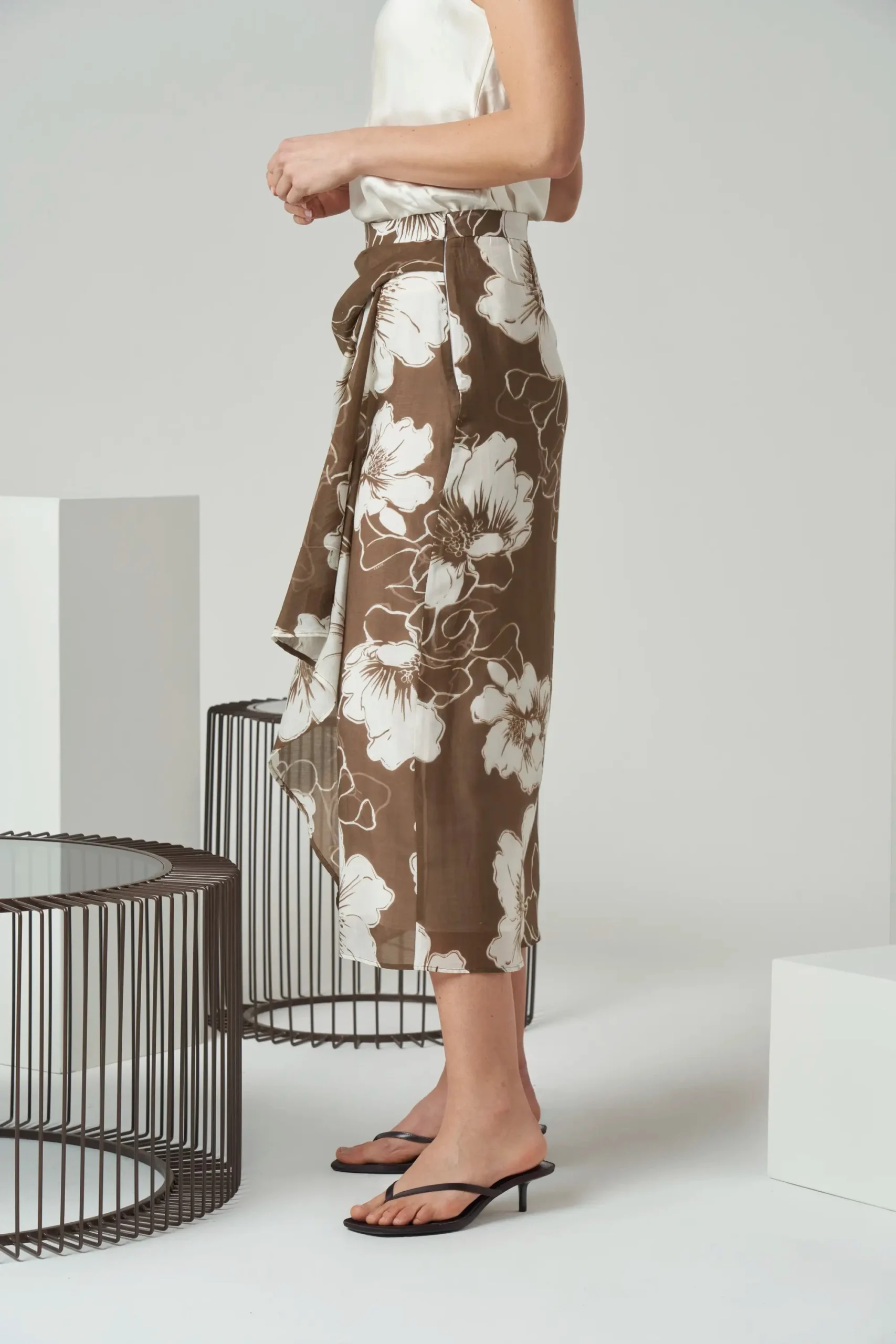 Printed skirt in cotton-silk blend with fluid silhouette.